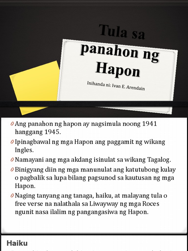 Slide 8 of 10 of Panitikan sa Panahon ng Hapones. Kung nag enjoy po kayo pakibigyan naman po ng isang malupitang like share and comments. ARCEO Enero 3 1924 Disyembre 3 1999 Kauna-unahang Pilipino na nakasulat ng soap opera sa radyo Nakasulat ng 3000 na nobela 2000 na maikling kuwento 36 tomo na iskrip sa radio Nakatanggap ng Carlos Palanca Award noong 1962 FRANCISCO SOC RODRIGO Enero 29 1914 Enero 4 1998 Nagsulat ng tanyag na dula na Sa Pula Sa Puti Naging senador sa ilalim ng.