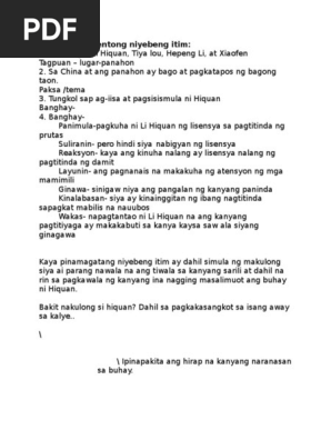 1 Montrez les réponses. Itim ni Liu Heng Tauhan Li Huiquan Tiya Luo Tiyo Li Luo Xiaofen Tagpuan Lugar Panahon Paksa Tema Banghay Panimula Paano sinimulan ng may-akda ang kwento. Banghay ng kwentong niyebeng itim ni liu heng moy27.