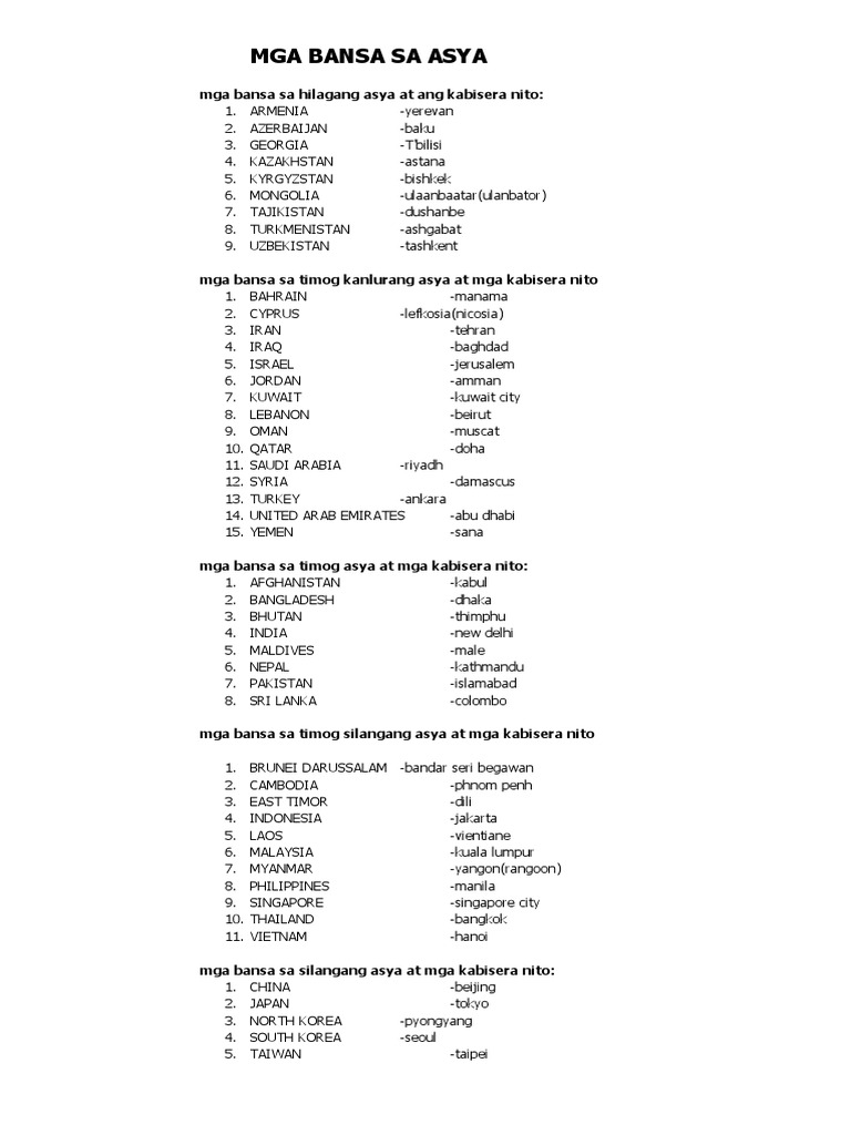 Mga Bansa Sa Gitnang Asya At Kabisera Nito