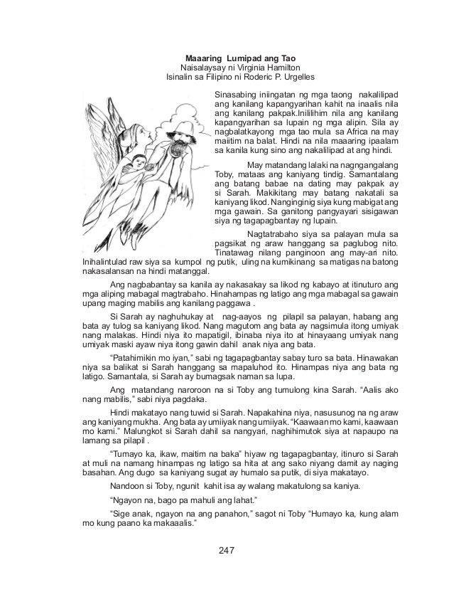 Virginia Hamilton Isinalin ni. PANIMULA Iniingatan ng mga taong nakalilipad ang kanilang kapangyarihan Nagpapanggap na lamang silang ordinaryong tao na nagmula sa Africa na may maiitim na balatMay matandang lalaki na nagngangalang Toby at si Sarah naman ay may dalang bata sa likod at sila rin ay may dating pakpak. Sila ay nagbalatkayong mga tao mula sa Africa na may maiitim na balat.